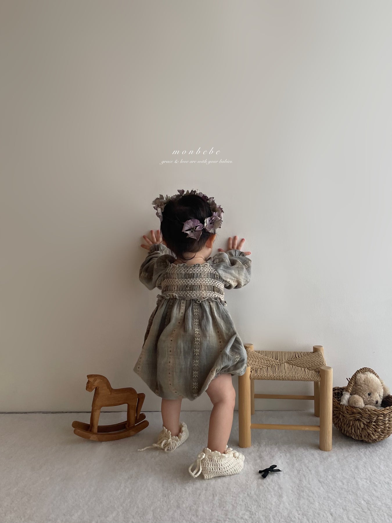 胸元のシャーリングデザインがふんわりと広がり、赤ちゃんらしい柔らかさを引き立てます